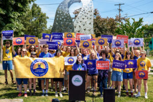 A few days later, we were joined by State Treasurer Mike Pieciak to officially announce the Democracy Summer Canvass, with a message of embracing unity and rejecting oligarchy. We held a press conference in Burlington’s Dewey Park, fittingly framed by the “Embrace and Belonging” sculpture.